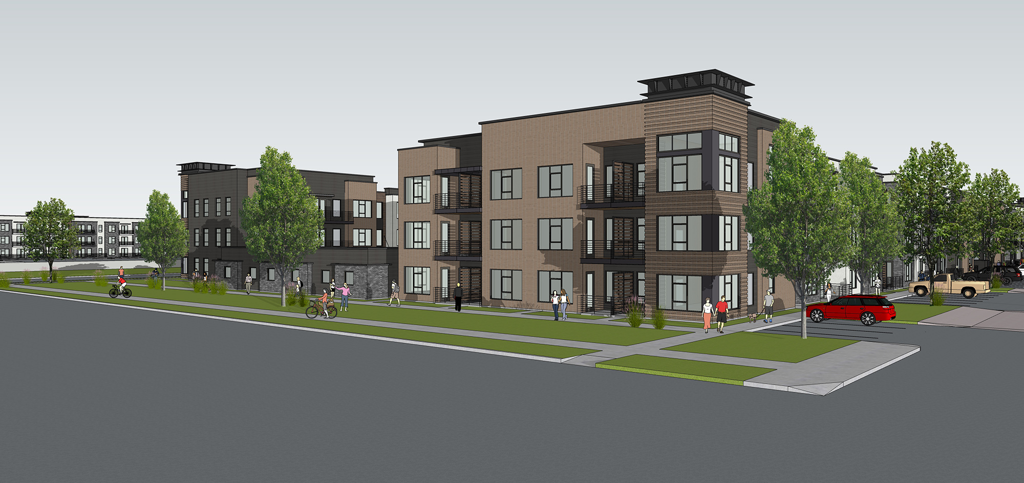A 3-story garden style project is designed with an urban feel on a Wheatridge site. The contemporary design engages strongly with the surrounding streetscape and building masses conceal parking areas from public view. On the non-street side the buildings provide tuck-under parking which ensures the interior of the site is not a field of asphalt. The center of the sire is anchored by the pool courtyard accompanied by the clubhouse which is tucked into one of the residential buildings.