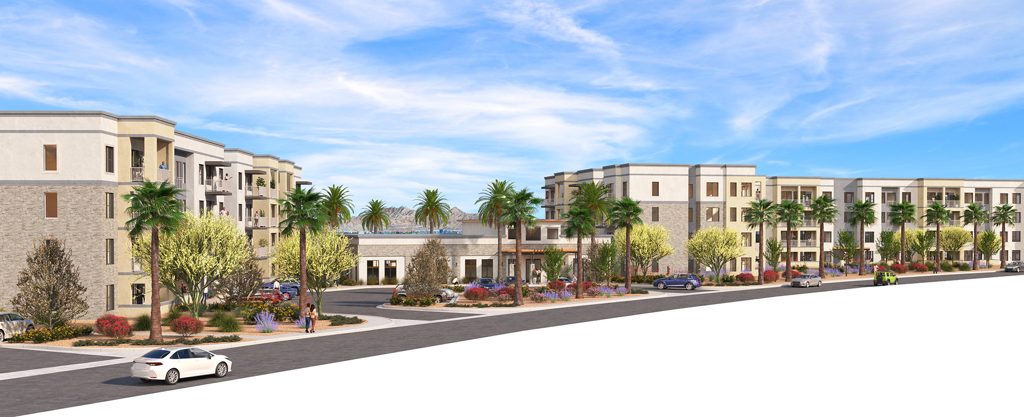 This active adult community is located in the mixed-use community of Gilbert Town Square. The massing is Broken into two 4-story buildings with a single-story clubhouse in between. This interruption of the building mass allows light and view to come through, and create a resort like feel. The clubhouse offers a full width logia to the pool deck and the two residential buildings provide a sense of enclosure to the main outdoor amenity area. Building architecture is heavily influenced by the Arizona aesthetic and the existing architecture of the town square.