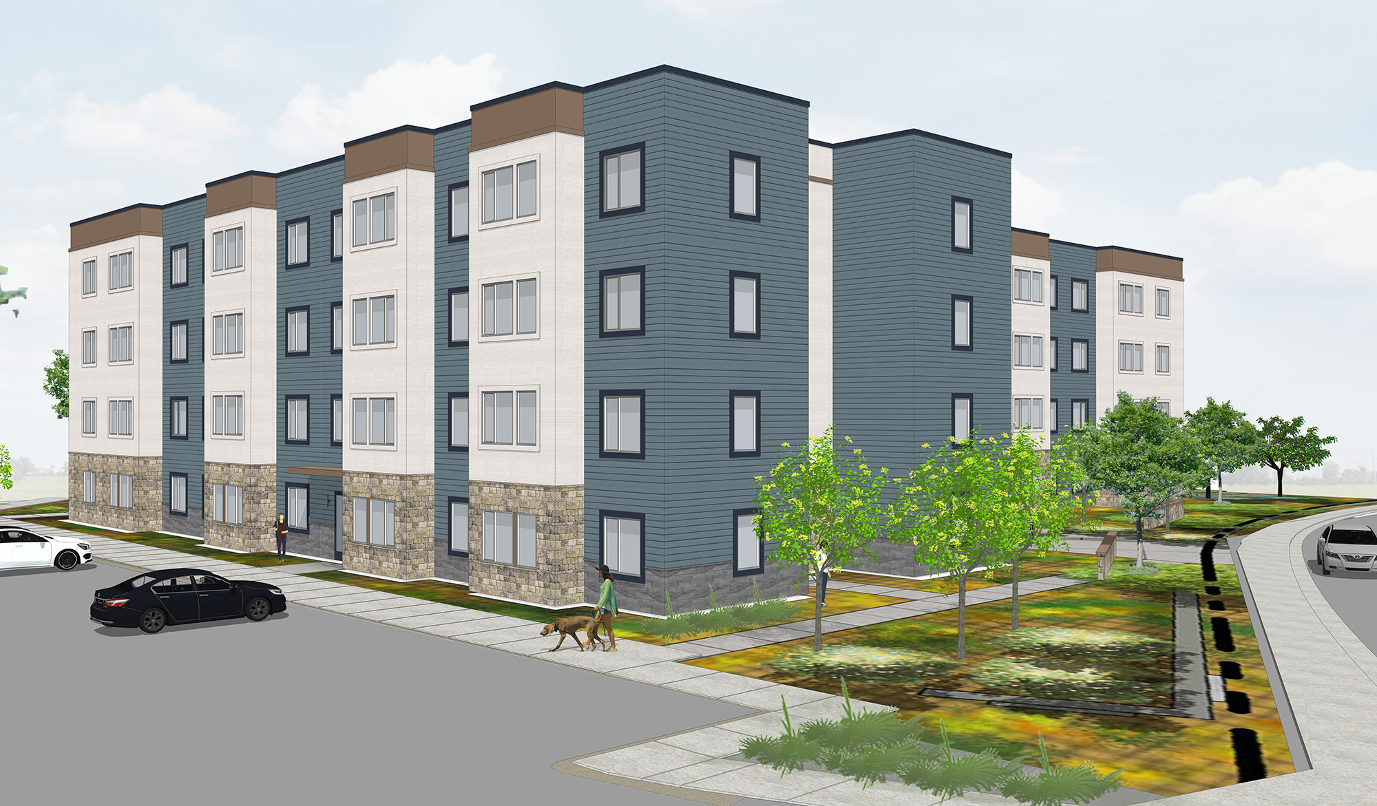 Northeast entrance rendering for Westbury with parking in foreground